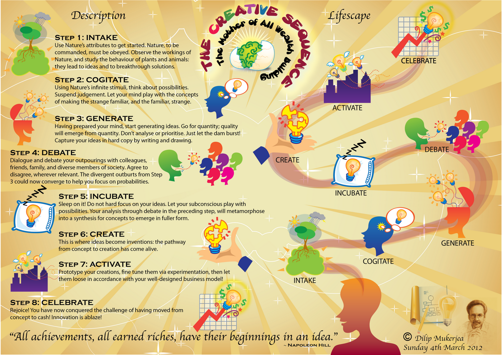 Once you have slept and dreamt and chewed on your ‘stable combination’ of ideas you can start to create – yahay! – (step 6) and then consolidate (step 7 – Activate) your work around your ideas, using the earlier steps in repetition as a means of continually building on your current set of ideas. Keep notes on how this works for you and where and when you need to do something that disrupts the process and starts another cycle such as celebrate! (stage 8).